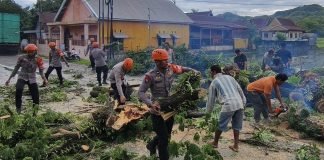 Tim SAR Brimob Polda Sulsel Evakuasi Pohon Tumbang di Jalan Poros...