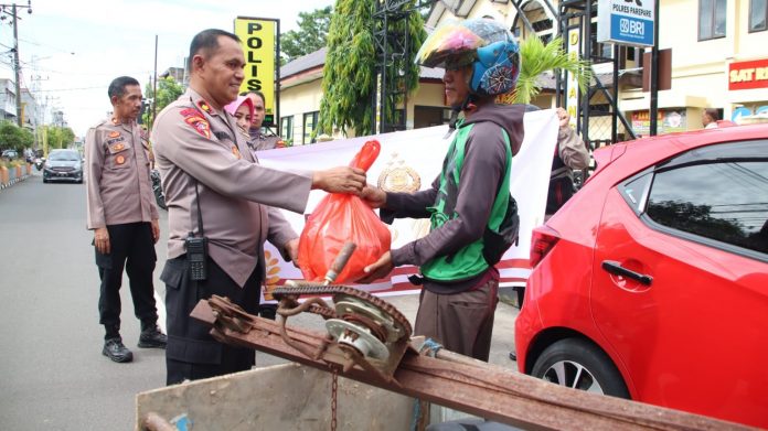 SMARTNEWSCELEBES.COM, PAREPARE – Ratusan paket sembako disalurkan Polres Parepare kepada warga yang terdampak kenaikan harga bahan pokok penting (Bapokting) Jelang Hari Raya Idul Fitri 1444 H, Selasa (28/03/2023)