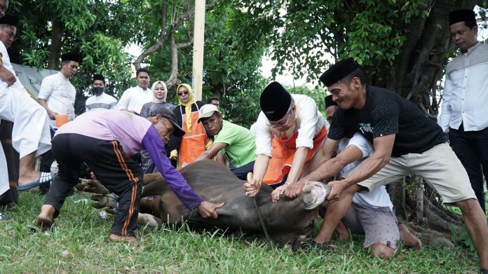 SMARTNEWSCELEBES.COM, PAREPARE – Ketua DPD Partai Golkar Sulawesi Selatan, Taufan Pawe sembelih hewan qurban sebanyak 4 ekor sapi milik DPD Golkar Parepare di Kantor DPD Partai Golkar Parepare. Kamis, 29 Juni 2023.
