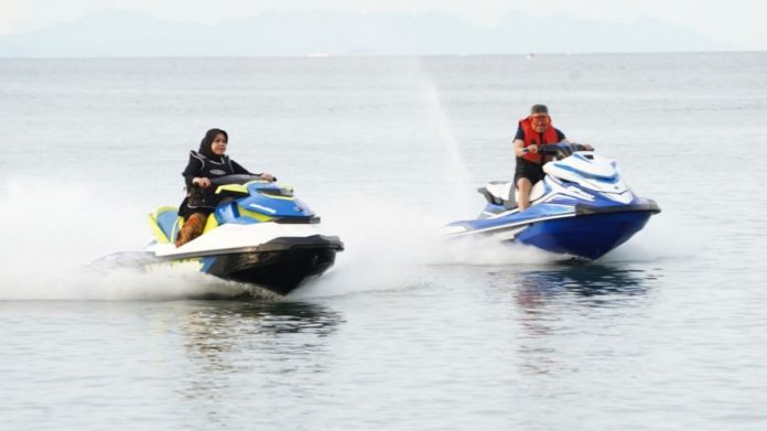 SMARTNEWSCELEBES.COM, PAREPARE – Wali Kota Parepare, Taufan Pawe (TP) bersama Ketua TP PKK Erna Rasyid Taufan (ERAT) memanfaatkan hari libur nasional dengan memainkan Jet Ski di Pantai Lowita, Suppa Kabupaten Pinrang, Sulawesi Selatan, Jumat 30 Juni 2023.