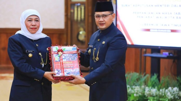 SMARTNEWSCELEBES.COM, SURABAYA – Gubernur Jawa Timur, Khofifah Indar Parawansa menyerahkan Surat Keputusan Menteri Dalam Negeri Nomor 100.2.1.3-72 Tahun 2024 tentang Perpanjangan Masa Jabatan Penjabat (Pj) Wali Kota Batu.